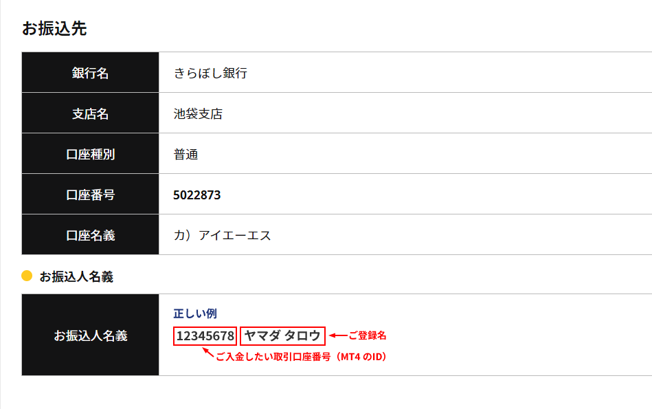 また、振込む際には振込人名義の名前の前に必ずIS6FXの口座番号を記載する必要があります。