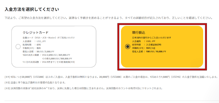 - 手数料をかけずに入金するなら、クレジットカード/デビットカードを利用する