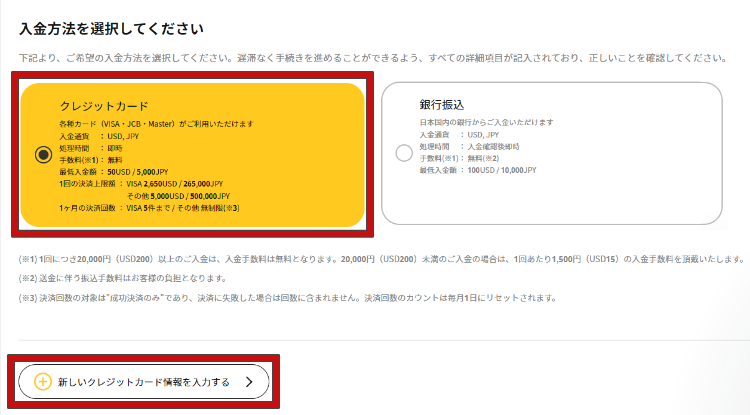 入金方法選択画面に切り替わったら「クレジットカード」を選択し、「新しいクレジットカード情報を入力する」をクリック