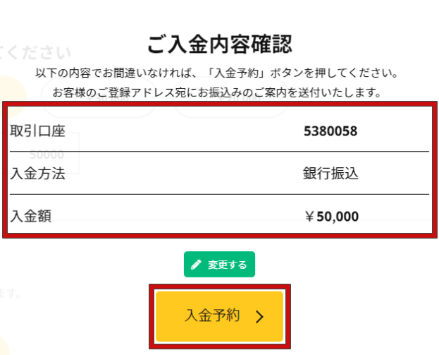 上の図のとおり「ご入金内容確認」画面が表示されます。取引口座の番号をメモしておきましょう!