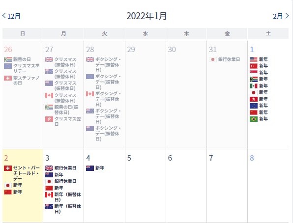 たとえば、上の図のように年末年始では世界の銀行の振替休日などは市場が閑散とした状態になります。3日の月曜日は、日本と英国の銀行が休日なので、日本市場からロンドン市場の取引時間帯は個人投資家のみの注文しか入らないことが想定できます。