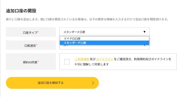 口座を開設すると上の図のように追加口座の開設というボタンがあり、クリックすると追加で開設する口座タイプが選択できるので、簡単に追加口座を開設できます。