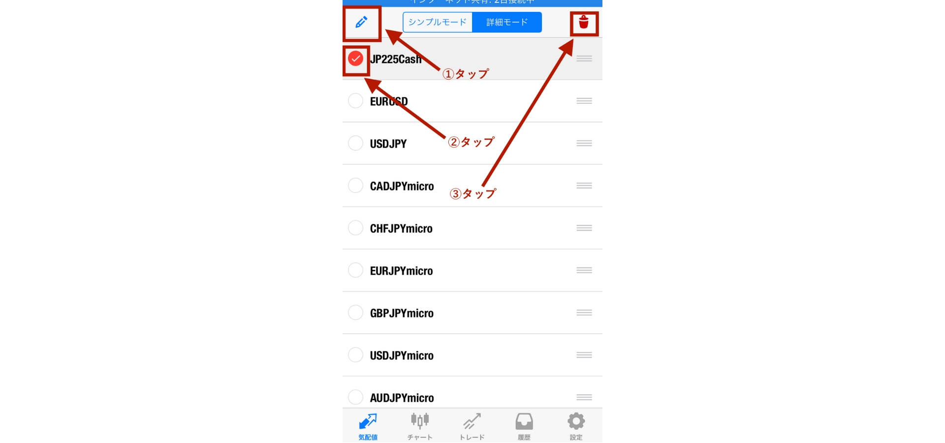 シンプルモードも詳細モードもそれぞれ通貨ペアが表示されていますが、この表示されている取引銘柄を自分専用に整理、カスタマイズしましょう。
